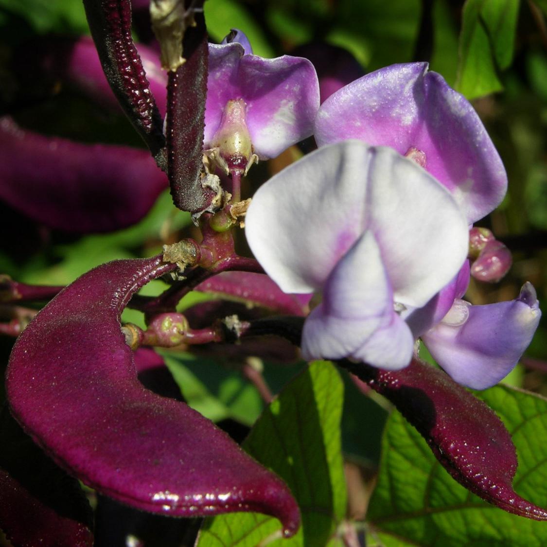 Темно-бордовые плоские бобы долго украшают растение осенью. Вьющийся однолетник с пурпурно-белыми цветками в рыхлых соцветиях. Листья темно-зелеными с красным отливом на красно-фиолетовых черешках. Соцветие-кисть длиной до 40 см, обладает слабым ароматом. С июля и до конца октября плотно декорируют поверхность на высоту 2,5-4 м. Необходимо подвязывание. Используют для вертикального озеленения домов, заборов, отдельно стоящих беседок.