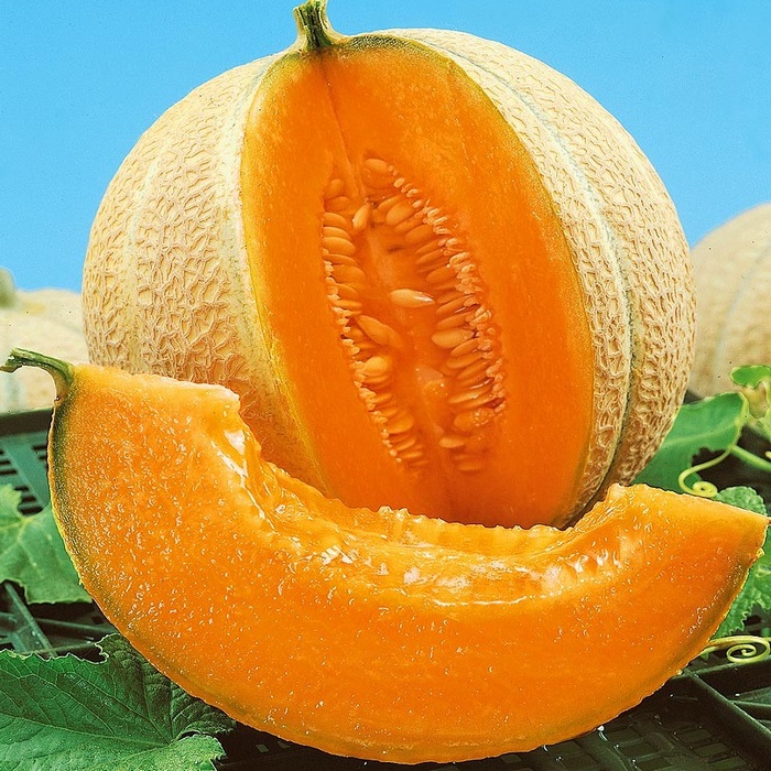 Некрупная порционная дыня с сочной и плотной маслянистой мякотью отличного сладкого вкуса. У полностью зрелых дынь мякоть приобретает красивый лососевый цвет и сильный приятный аромат. Плоды шаровидной формы, ребристые, желто-оранжевые с чуть более темными полосками.