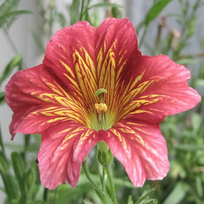 Изюминкой его цветков является восхитительно нарядная золотистая «сеточка». Растение принадлежит к семейству Пасленовые. В садоводстве культивируется 1 вид этого рода – сальпиглоссис выемчатый, одиночные цветы которого имеют воронкообразную форму с 5-лопастным отгибом, напоминающие граммофон. С помощью растения создаются замечательные композиции на дачных участках и клумбах. Чудесно сочетается с почвопокровными видами, например, лобелией.