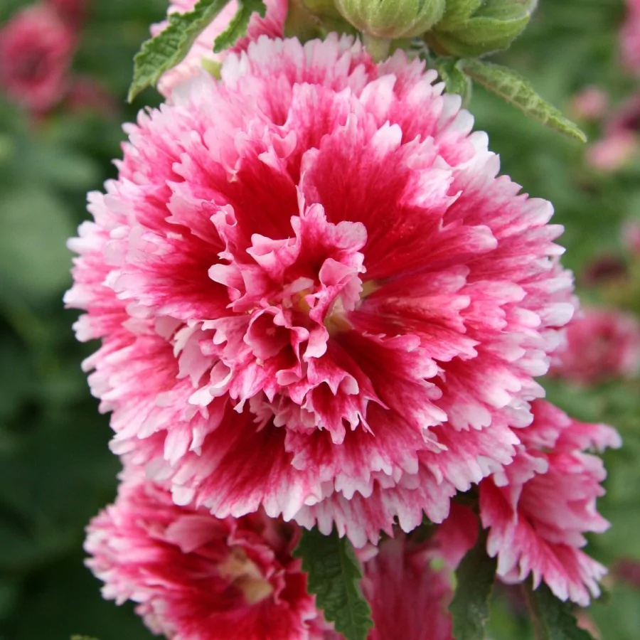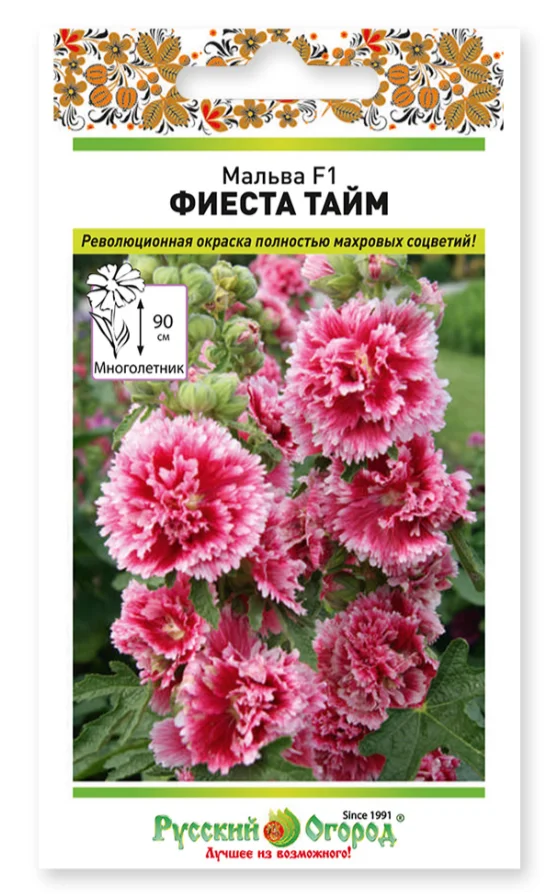 Мальва сорта Фиеста тайм F1 отличается обильным и продолжительным цветением. Это двулетнее растение, но цветёт уже на первый год. С момента посадки семян в почву до появления первых настоящих цветов проходит чуть менее трёх месяцев.Соцветия представлены в виде бутонов, оригинальной, очень насыщенной окраски, с махровыми густыми и плотными лепестками. Такое чудо селекционной мысли способно порадовать любого садовода и просто ценителя всего прекрасного. На складчатых лепестках красный цвет постепенно переходит в насыщенно малиновый тон, а у самых краёв – в белый. Растения идеально впишутся в любую растительную композицию, хорошо подходят для праздничного оформления помещений. Особенно хороши цветы яркой мальвы в срезанном виде, они долго сохраняют свой превосходный свежий вид.