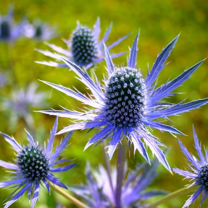 Синеголовник плоский семейства Зонтичные - самый распространенный вид на территории России, в народе называемый «Морской Падуб», «Морской Холли», «Эринго». Цветоводы совершенно справедливо восхищаются растением и прозывают его «садовой статуей». Соцветия этого растения состоят из крошечных цветков, собранных в головки, окруженных частоколом плоских колючих горизонтальных прицветников. Верхняя часть стеблей и соцветия имеют оттенки синего или фиолетового цветов, из-за такой специфической внешности перепутать его с другими растениями очень сложно. Как любое растение с неординарной внешностью, синеголовники требуют от садовников наличия тонкого вкуса, подобным харизматичным экземплярам нужно найти достойное окружение, дуэт с популярными петуниями или бархатцами вряд ли будет гармоничным. Синеголовники идеально подходят для посадок в миксбордеры природного стиля, гравийном саду, альпинарии или контейнерах. Идеальными соседями для них являются шалфеи, пенстемоны, эхинацеи, декоративные злаки. Эффектен он крупными куртинами среди трав.