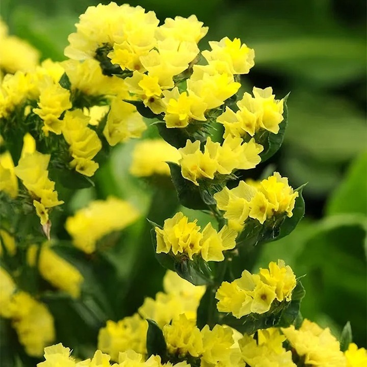 Уникальное декоративное растение, формирующее до 15 прямостоячих побегов, увенчанных крупными (10-12 см) щитковидными соцветиями. Крошечные желтые цветочки, высыхая, сохраняют форму и яркость, не осыпаются. Статица в основном выращивается для срезки и создания композиций из сухих цветов. Отлично подходит для оформления цветников.