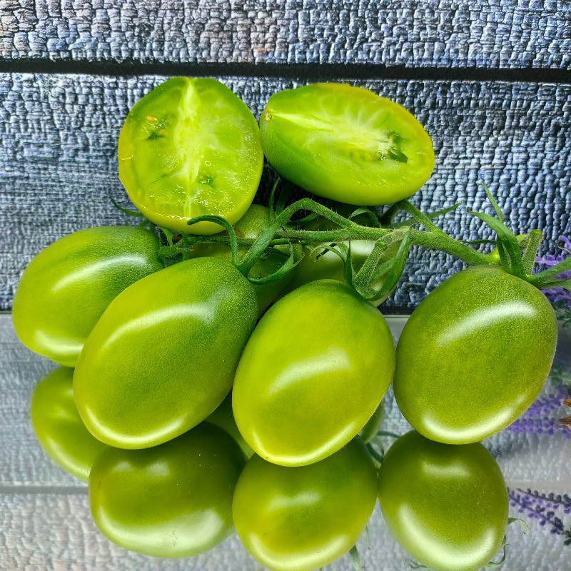 Среднеспелый сорт – 110-115 дней от всходов до плодоношения. Детерминантный, высокорослый, растение крупное, быстро развивающееся. Кисть сложная, разветвленная, состоящая из 7-9 плодов. Плоды овально вытянутой формы, плотные, блестящие, массой до 100 г, зеленого цвета как в технической, так и в биологической спелости. При созревании на кожице появляется желтоватый румянец. Мякоть изумрудного цвета, очень нежная, сладкая. Назначение десертное.