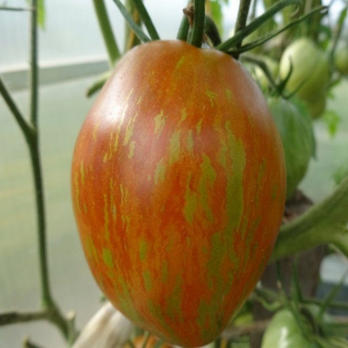 Новый урожайный гибрид с восхитительными овальными плодами с носиком, необычной тигриной окраски, предназначенный для выращивания в теплицах, и под плёночными укрытиями и в открытом грунте, во всех регионах России. Растение высокорослое ( 170-200 см.), среднеспелое (105-110 дн.) Плоды красные с зелеными полосками на поверхности очень высокого качества массой 80-110 г, мясистые, сочные, сладкие. Используются в свежем виде и для всех видов переработки. Устойчив к растрескиванию и вершинной гнили плода.