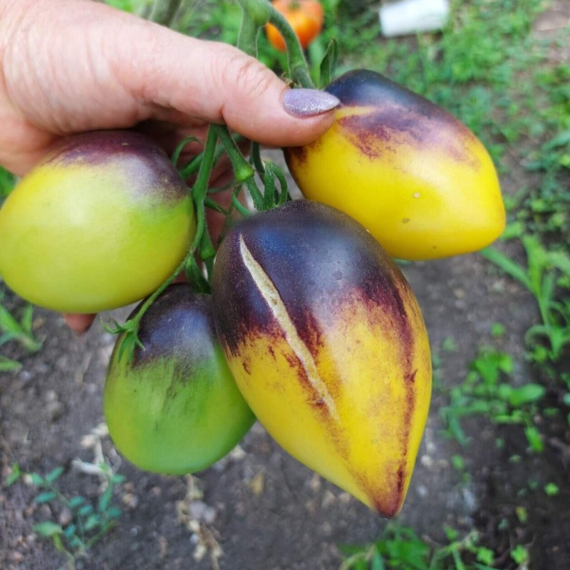 Это среднеранний сорт томатов, который вырастает до 2 м в высоту в теплице. Чтобы получить хороший урожай, рекомендуется формировать куст в два стебля, регулярно удалять пасынки и подвязывать растение. У этого сорта гибкие стебли, напоминающие лианы. Он отличается высокой урожайностью и способностью выдерживать большую нагрузку на куст. Плоды этого сорта имеют округло-сливовидную форму, и светло-жёлтый цвет с густым чёрным антоцианом. Кажется, что помидорки светятся изнутри. Вес каждого плода составляет от 100 до 250 г. Эти томаты растут кистями. Мякоть у них густая, плотная и сладкая, почти без кислоты. Они отлично подходят для свежего потребления и приготовления соков.