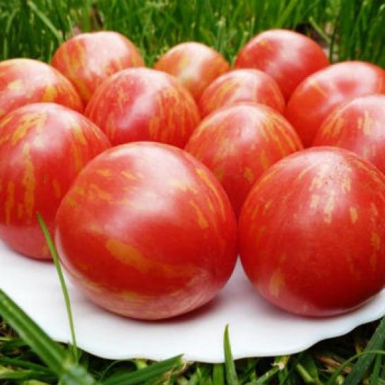Раннеспелый (95-100 дней) сорт для открытого грунта и пленочных укрытий. Растение детерминантное, высотой 60-70см, штамбовое. Не требует обязательного пасынкования. Плоды овальные, малиновые с тонкими желтыми полосками, среднеплотные, массой 70-80 г, мясистые, отличного вкуса.